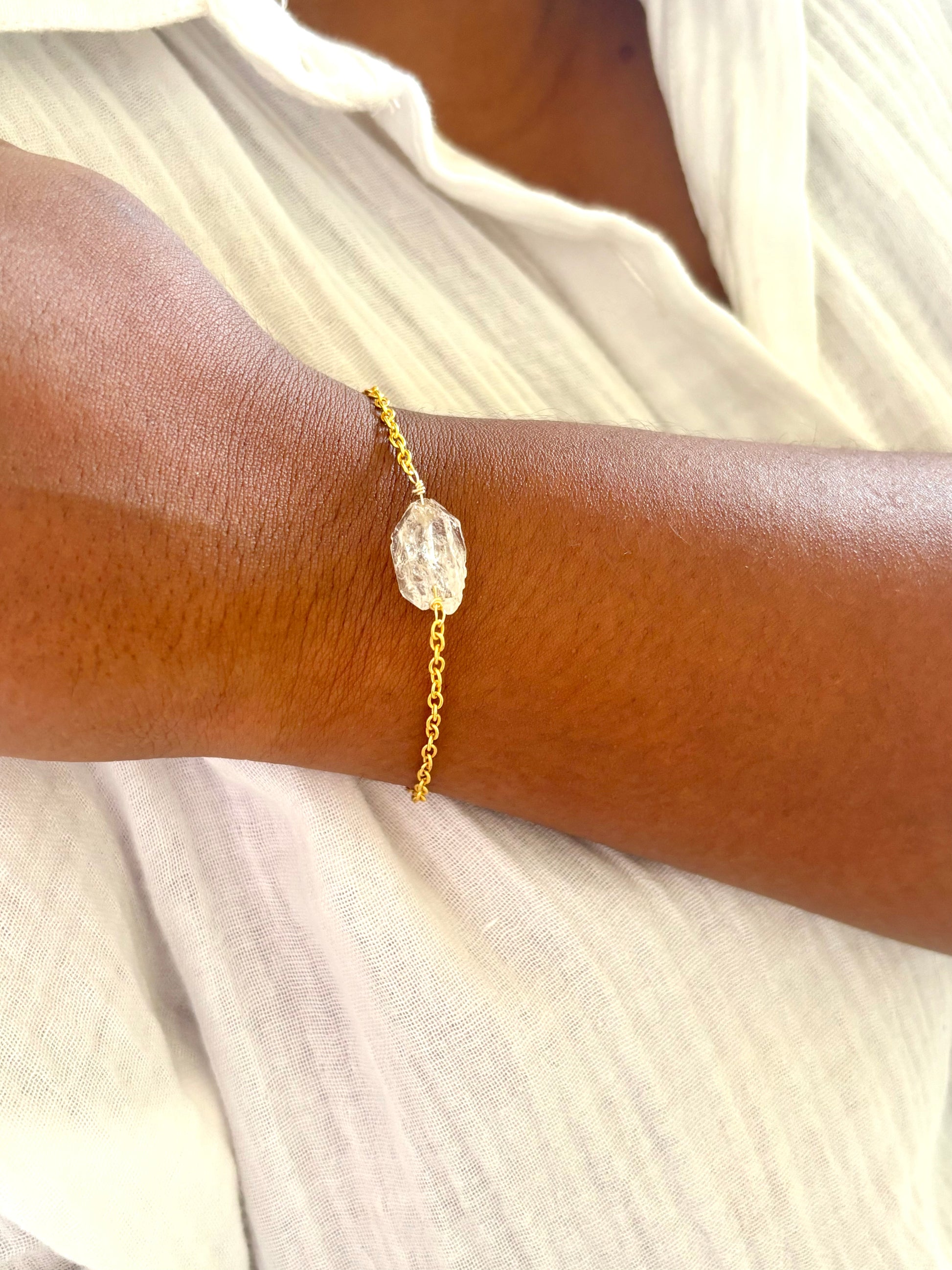 Experience the healing powers of our Herkimer Diamond Tumbled Bracelet. Made with authentic Herkimer diamonds and 18k gold plating, this bracelet radiates positive energy and promotes inner strength. Add a touch of elegance to your daily wear while reaping the benefits of this unique gemstone.