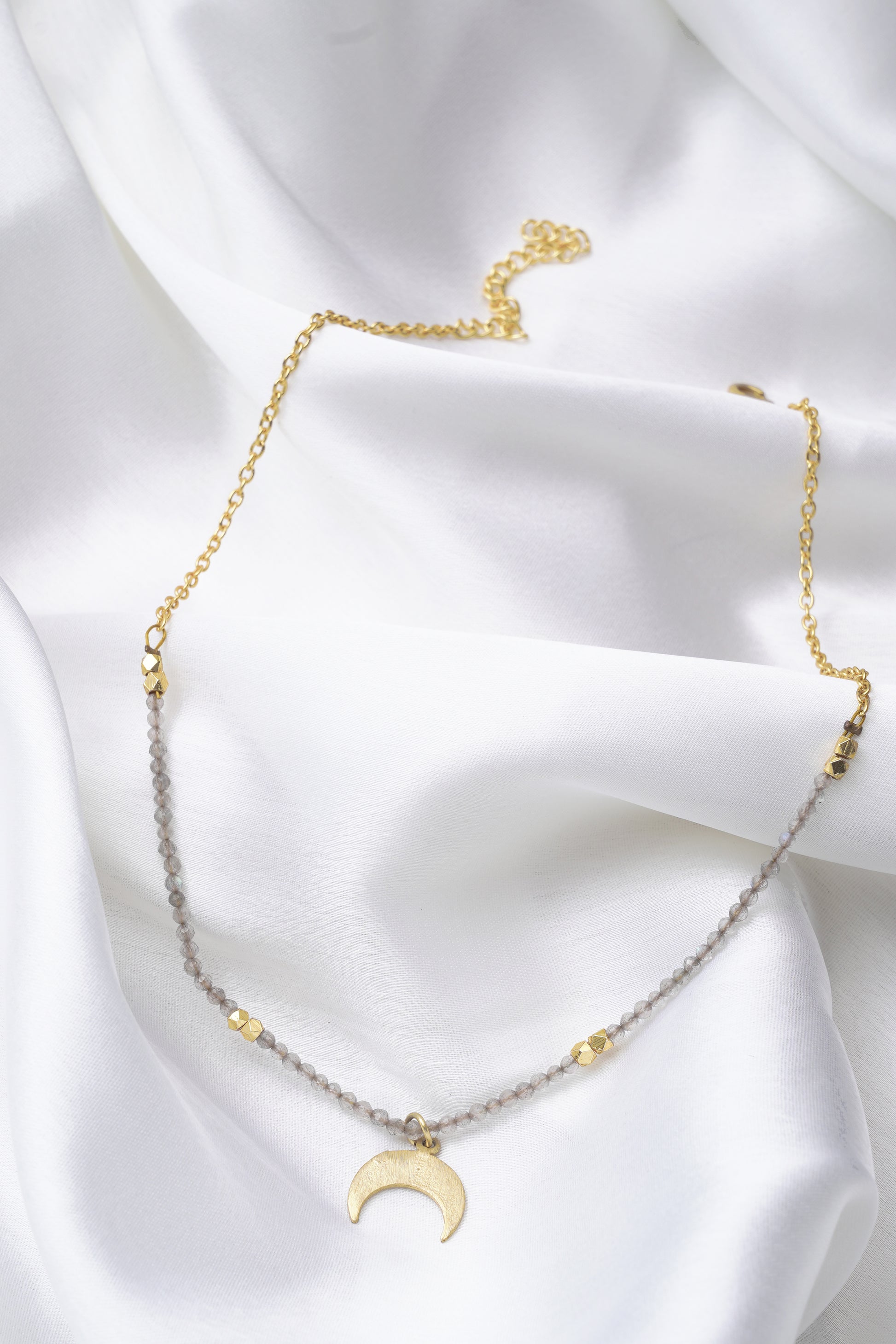 Connect with your inner peace and connect with the energy of the moon with our Labradorite de Luna necklace. Featuring a minimalistic labradorite chain and a delicate moon charm, this piece will enhance your spiritual journey and add a touch of elegance to any outfit.This beautiful piece is hand strung and is suitable for everyday wear.
