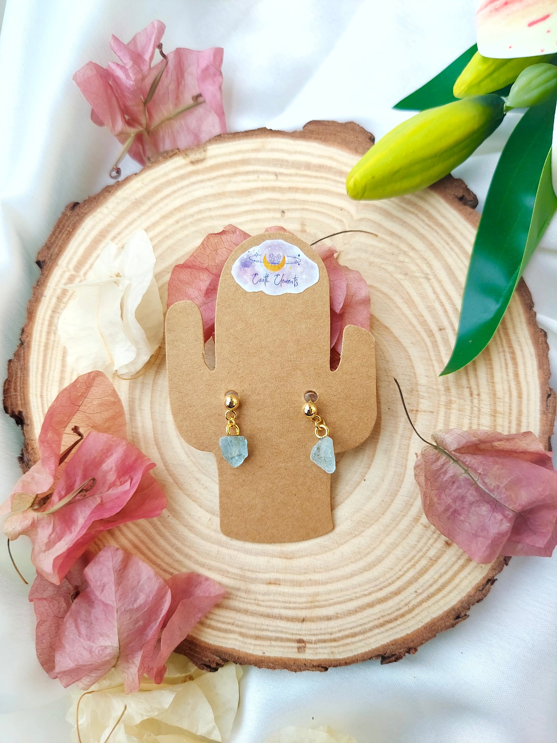 Pair of raw Aquamarine minimalistic earrings made with stainless steel that is 18k gold plated and is anti-tarnish and hypoallergenic. It is nickel and lead free as well.