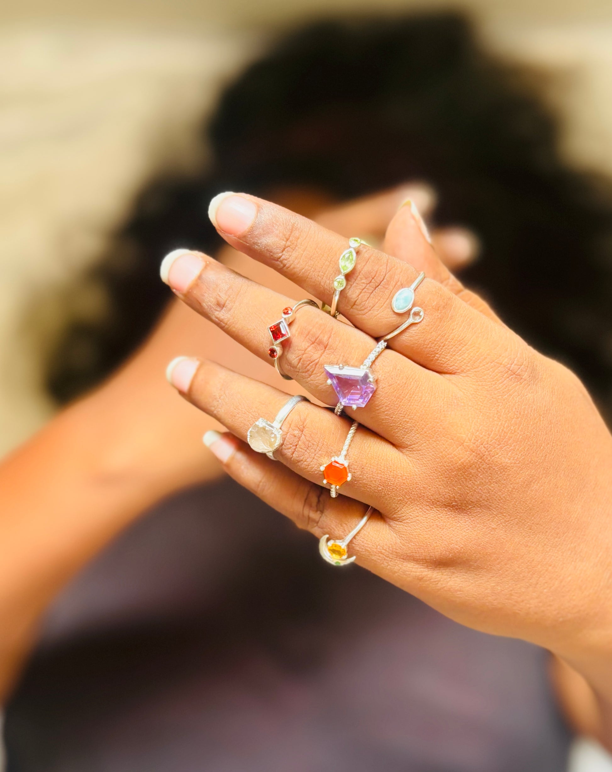 Add a touch of celestial beauty to your look with the Ring De Luna. This stunning piece features a delicate moon with a sun ring and sparkling citrine gemstone. Crafted from high-quality 925 sterling silver, this ring is not only stylish but also durable. Perfect for any occasion or as a meaningful gift for a loved one. The little stone on the Moon is Tsavourite which perfectly compliments the Citrine